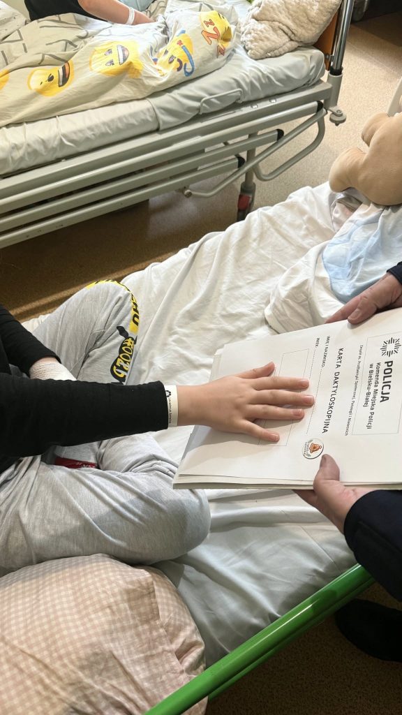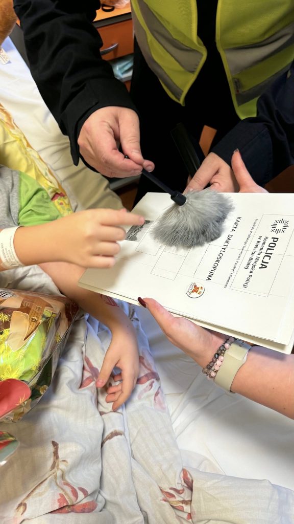 Podczas spotkania wręczyli dzieciom świąteczne paczki, wykonywali odbitki linii papilarnych w formie zabawy edukacyjnej oraz rozmawiali z najmłodszymi o ich zainteresowaniach i marzeniach. Wspólnie spędzony czas upłynął w ciepłej, pełnej uśmiechów atmosferze, a mali pacjenci choć na chwilę mogli zapomnieć o trudach leczenia.